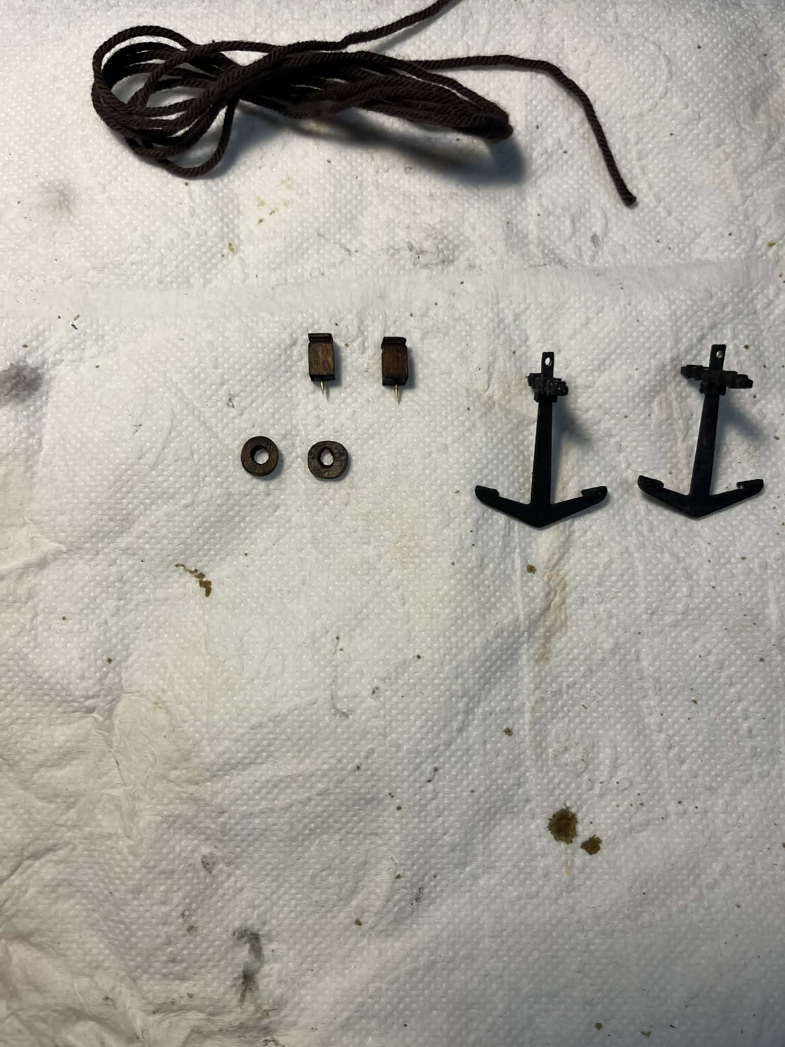 Przygotowałem kotwice zgodnie z instrukcją. Zdecydowałem się dodać kilka dodatkowych elementów - słupki na burtach do mocowania kotwicy oraz przepusty na pokładzie dla lin kotwicy. Nie wiem czy takie rozwiązanie jest sensowne w takiej jednostce, ale jak już to sobie powiedzieliśmy - jednostka fikcyjna, więc puszczam wodze fantazji