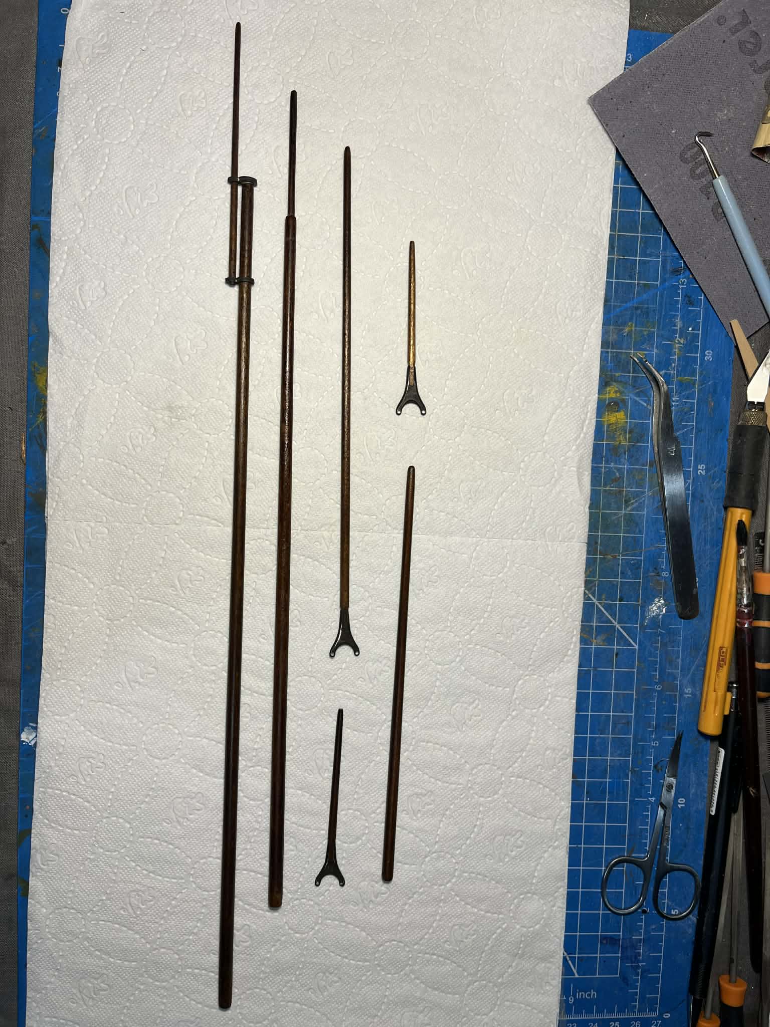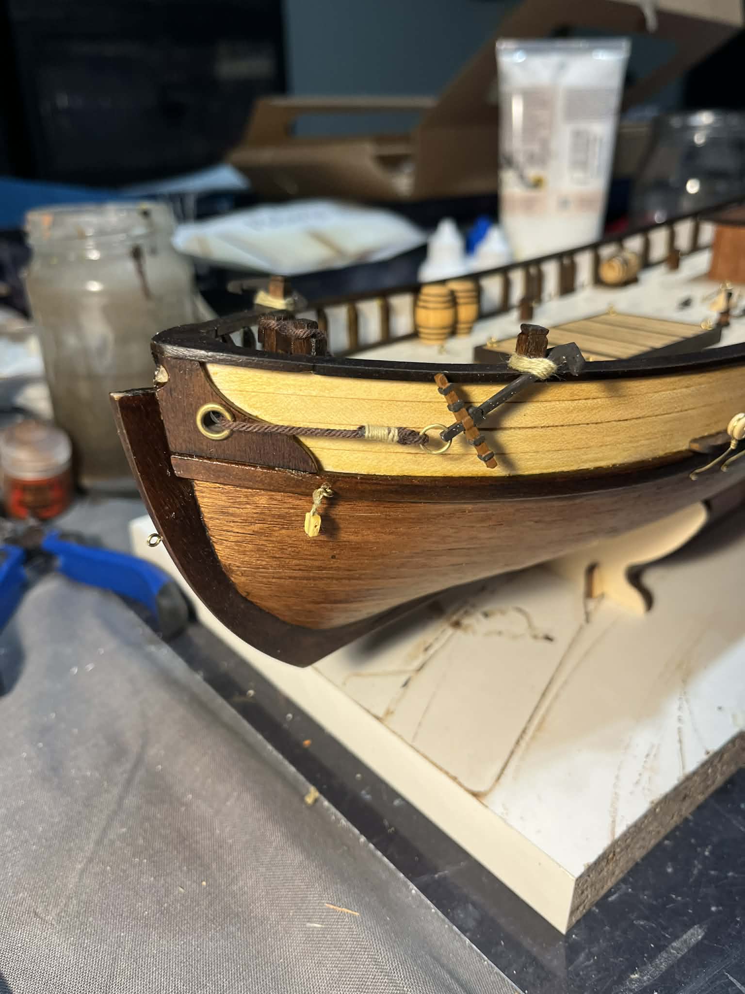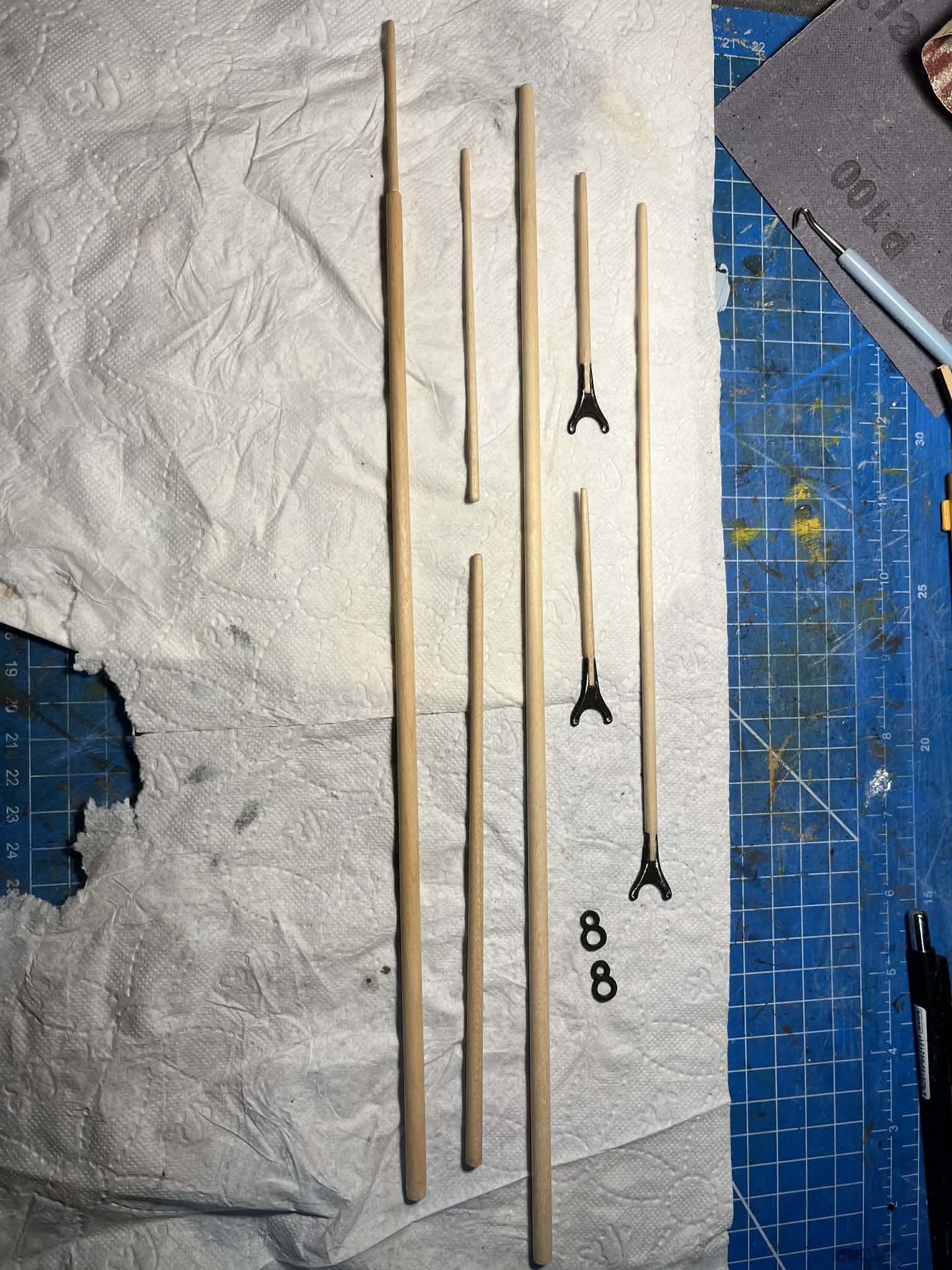 Zeszlifowałem maszty do wymiarów w projekcie, pociągnąłem je bejcą i lakierem matowym. W kolejnym kroku przejdę do wiązania bloczków i dodatków na poszczególnych elementach.
