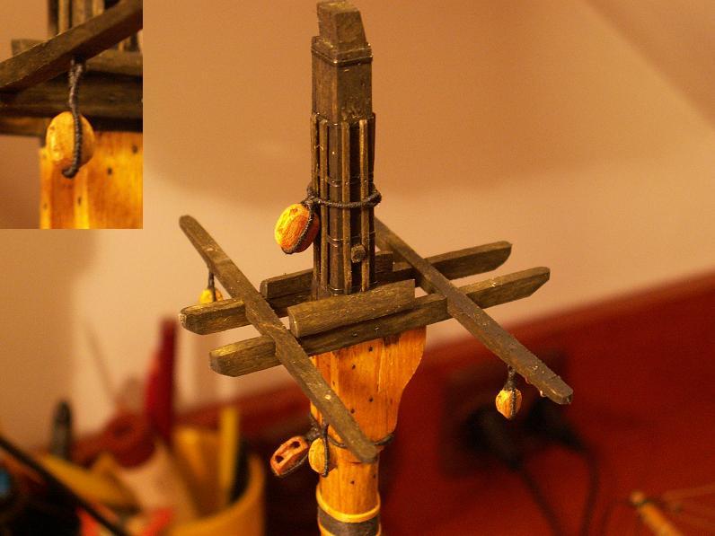 No a poniżej mocowanie bloków sztagów idących ze stengi grotmasztu. Można powiedzieć ze przyszywam je węzłem wiązanym przy pomocy igły.