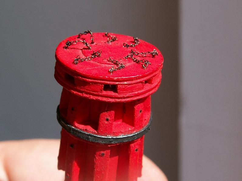 Wczoraj w czasie reklam leciało mało filmów przyrodniczych o Żubrach. Skróciłem więc czas antenowy:)przycinając przewód anteny i z ekranu przewodu porobiłem 8 łańcuchów skobli handszpaków inaczej mówiąc wziąłem sie za wykończanie kabestanu. Oczywiście można go nadal wyjmować z pokładu jak i zejściówkę. A to tylko dla tego zebu przy motaniu węzłów na kołkownicy osady grotmasztu mieć większe pole manewru. Na stałe przykleję po wiązaniu. Poniżej dwudniowa robocizna.