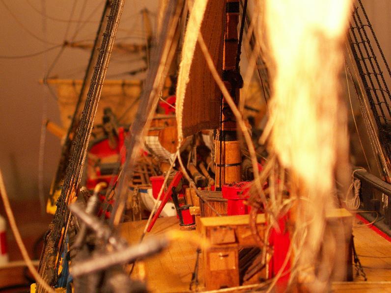 Mirek moze i przyjadę do Tczewa z modelem. Nie obiecuję. Boję się ryzyka z podróżą ale każdy strach można pokonać:) No a poniżej szoty bezansztaksla. Brakuje fałów do szotów.