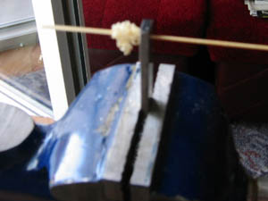 "Teraz pojedz do supermarketu i kup sobie wiązkę bambusowych patyczków do szaszłyków. Weź jeden z nich i ostrożnie rozłup go ostrym nożem wzdłuż na trzy, cztery części (jeśli Ci Się uda) tak, aby w tak otrzymanym cienkim patyczku włókna biegły wzdłużnie a grubość tego patyczka powinna być tylko nieco większa od największego otworu w Twej płytce. Patyczek ow nie musi być okrągłym po tym rozcięciu. Zaostrz jego jeden koniec, żeby wyglądał jak ostro zatemperowany ołówek. Ostra jego końcówka powinna teraz wejść w największy z otworów w płytce i nieco wystawać (parę milimetrów) z drugiej jej strony. Płytkę zamocuj w imadle w pozycji poziomej, aby rząd otworów wystawał nieco ponad szczeki imadła, a powierzchnia płytki z ostrymi krawędziami otworów, powinna być po przeciwnej stronie od Ciebie.