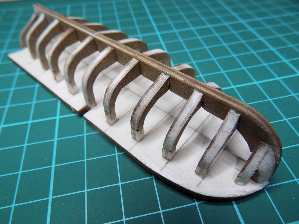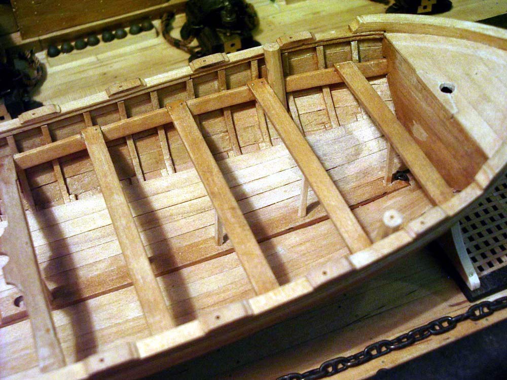 Wręgi w zestawie są zbyt toporne (jest ich za mało, są za szerokie i za grube). Jeżeli ktoś zdecyduje się na waloryzację, to na temat francuskich łodzi okrętowych jest na forum bardzo dużo informacji i przykładów ich wyglądu, będę sukcesywnie coś podrzucał.