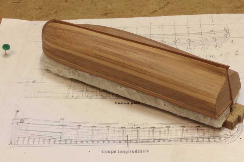 Na kopycie (oklejonym separatorem) największej łodzi robimy skorupę kadłuba. Oklejamy najpierw pawęż, potem robimy poszycie (wg zasad lub uproszczone, zależy od naszych chęci lub umiejętności). Wklejamy stewy, kil, ozdobne (profilowane) listwy burtowe lub/oraz odbojnice. Zilustruję budową szalupy z Royal Louis (z neta).