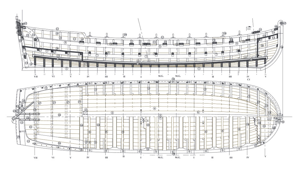 Jak porównamy planiki i niektóre modele zobaczymy kilka różnic, m.in. bakista - pokładzik dziobowy - może być pełny z otworem na fokmaszt lub w formie stałej lub demontowalnej ławki z jarzmem (widzimy na rysunkach). Tu nie potrafię rozstrzygnąć, która wersja będzie odpowiedniejsza dla epoki Soleil Royal.