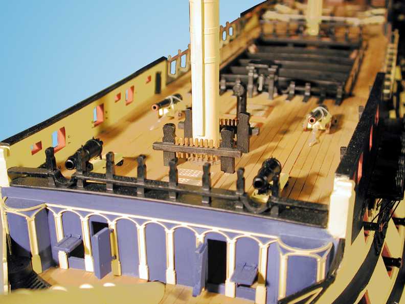 Na pokładach odkrytych (rufowym i dziobowym) instalowanie mniejszej liczby dział niż furt stanowiło prawie normę. Bardzo długo na pokładzie dziobowym w ogóle nie robiono żadnych furt, tylko takie obniżenia łukowe relingów (jak na zdjęciu), nad którymi można było łatwo wystawiać lufy dział czy karonad. Miejsce, w którym te działa aktualnie ustawiano, zależało od sytuacji bojowej – jeśli przeciwnik znajdował się idealnie przed dziobem (jak np. przed przełamaniem linii francusko-hiszpańskiej w bitwie pod Trafalgarem), to z pewnością strzelano w przód. Nie znaczy to, że karonady na Victory musiały tam tkwić do końca bitwy – dawały się przecież przestawić do wolnych furt w nadburciach.