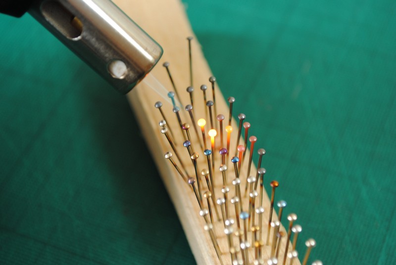 z poczernionych nad ogniem główek szpilek krawieckich o dwóch średnicach (główek):