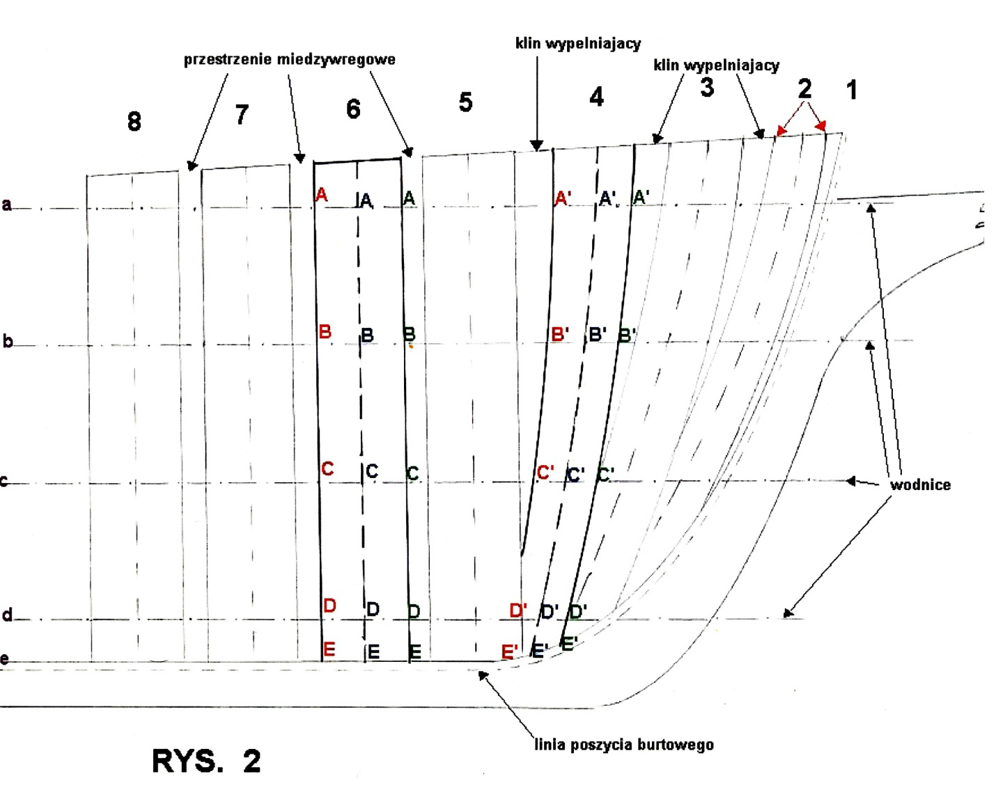Schematycznie widać tu fragment rzutu kadłuba widzianego od góry, tj. ten tzw. w/w half breadth plan. Symbole a, b, c, d, e przedstawiają owe wodnice (e jest jednocześnie długą osią kadłuba). Widać tez wyrysowane przestrzenie międzywręgowe szkieletu, aby zmniejszyć jego całkowita wagę i pozwolić na cyrkulacje powietrza miedzy nimi. Tuz przy dziobie, zamiast przestrzeni międzywręgowych zamontowano lite kliny wypełniające (filling wedges), dla wzmocnienia konstrukcji. Od poziomej osi centralnej modelu e, prostopadle do niej biegną podwójnej grubości wręgi (składające sie z dwóch warstw onej ‘kanapki’). Im owe wręgi są bliżej dziobu, tym ich zewnętrzne krawędzie są bardziej ‘skosowane’ (zacienione trójkątne pole u góry wręgi 6) – patrz w.w obłość kadłuba. Aby zaoszczędzić na materiale – i mniej skosować (drewno dębowe wówczas było bardzo drogie) oraz wzmocnić całość konstrukcji, wręgi najbardziej dziobowe i rufowe ustawiano juz nie prostopadle do długiej osi kadłuba, ale pod coraz bardziej ostrym kątem, wręgi pochylone, tzw. (ang.) cant frames – jak to widać na przykładzie wręgi nr. 4 na rys. 1. Skosowanie takich wręg trzeba wiec tez wykonać w miejscu ich polaczenia z kilem (ang. keel) – zacieniony trójkąt E’E’E’. Wręga nr. 5 jest ostatnia najbardziej dziobowa wręga, która jest jeszcze zamontowana pod katem prostym do długiej osi kadłuba.