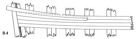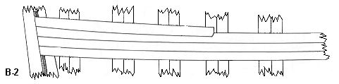 Na rysunku powyżej mamy pokazaną sytuacje, gdy na śródokręciu (wręga z prawej) widać, że w pasie miedzy battentami trzeba będzie położyć 4 listewki. Ponieważ górny batten wznosi się idąc ku rufie, powstaje stopniowo przestrzeń, której cztery listewki nie wypełnią - powyżej górnej, czwartej listewki będzie szpara , która będzie się poszerzać w kierunku rufy . Tą przestrzeń trzeba wypełnić stealerami.