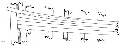 Rysunek A-3 pokazuje jak wkomponować listewkę biegnącą powyżej stealer'a . Kładziemy ją ciasno przy najwyżej położonej listewce i na stealerze . Nożykiem nacinamy stealer wzdłuż krawędzi górnej listewki . Następnie odcinamy górną cześć stealera.
