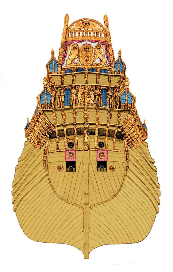 SOLEIL ROYAL, 1670 i jego bardzo bogate barokowe zdobienia galerii rufowej, których projektantem był Jean Berain