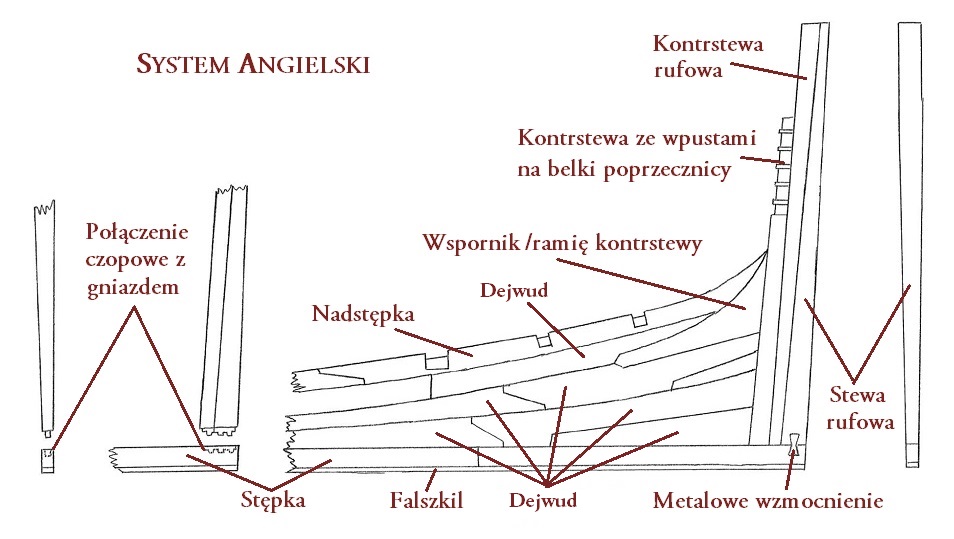 W poprzednich artykułach, analizując budowę szkieletu podłużnego kadłuba statku, podkreślaliśmy wielokrotnie, że połączenie stewy rufowej ze stępką wykonywano w sposób szczególny. Stosowano tak zwane połączenie czopowe z gniazdem czopu i czopem. Gniazdo czopu to czworokątne zagłębienie w stępce, czop zaś (wystający) znajdował się na dolnym krańcu stewy rufowej. Łącze takie stosowano z uwagi na kąt nachylenia względem siebie obu tych elementów. Połączenie czopowe jest solidne i wytrzymałe. Belka stewy rufowej była odpowiednio wyprofilowana, tak by mogła dostosować się do kształtu stępki. Inaczej mówiąc, na dole była cieńsza niż na górze. Niekiedy szkutnicy wykonywali w belce stewy rufowej i w stępce, na ich bokach, płytkie zagłębienia, w których umieszczali płytki metalowe. Płytki te były trójkątne, o przeciwstawnym kształcie.