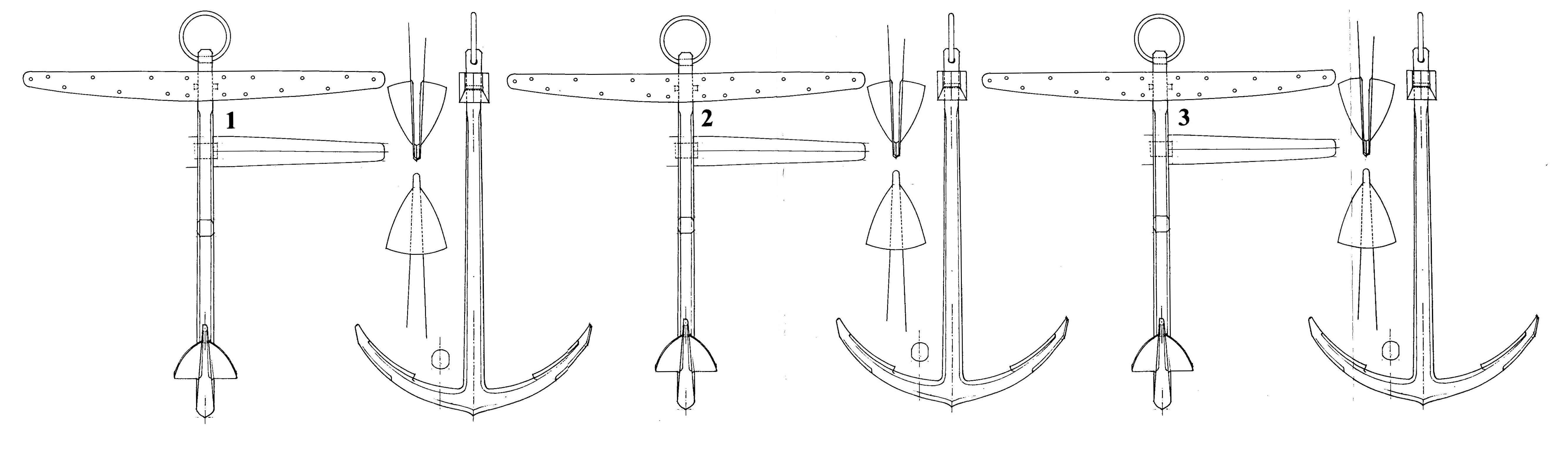 Kształt drewnianych poprzeczek przy typowych kotwicach epoki żagla.
